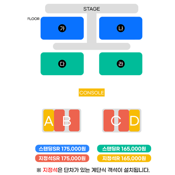 스탠딩 SR 175,000원, 스탠딩R 165,000원, 지정석SR 175,000원, 지정석R 165,000원입니다.