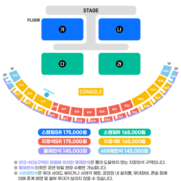 스탠딩SR 175,000원, 스탠딩R 165,000원, 지정석SR 175,000원, 지정석R 165,000원, 물제한석 145,000원, 시야제한석 145,000원입니다. 물제한석은 물이 도달하지 않는 구역의 좌석입니다.