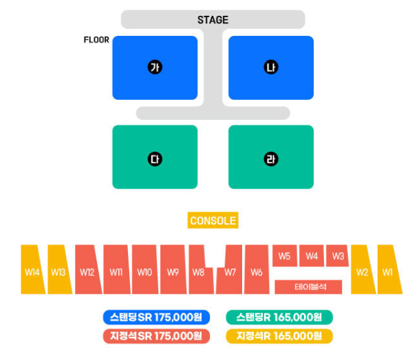 스탠딩SR 175,000원, 스탠딩R 165,000원, 지정석SR"커플석" 350,000원, 지정석SR 175,000원, 지정석R 165,000원, 지정석S 155,000원입니다.